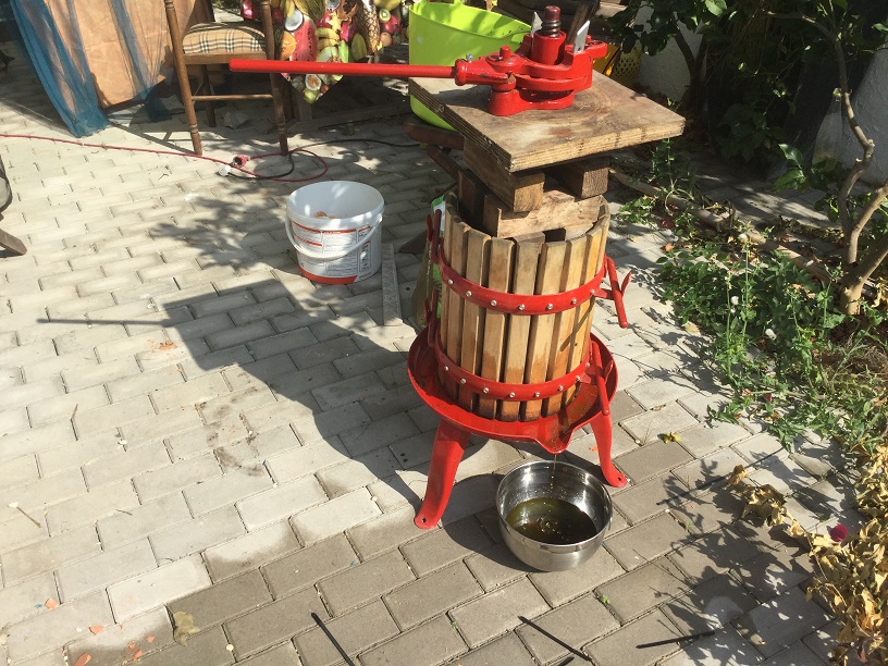 La presse est montée et l'huile et l'eau contenues dans la pâte se déversent dans le bocal. Leur séparation se fera par décantation.